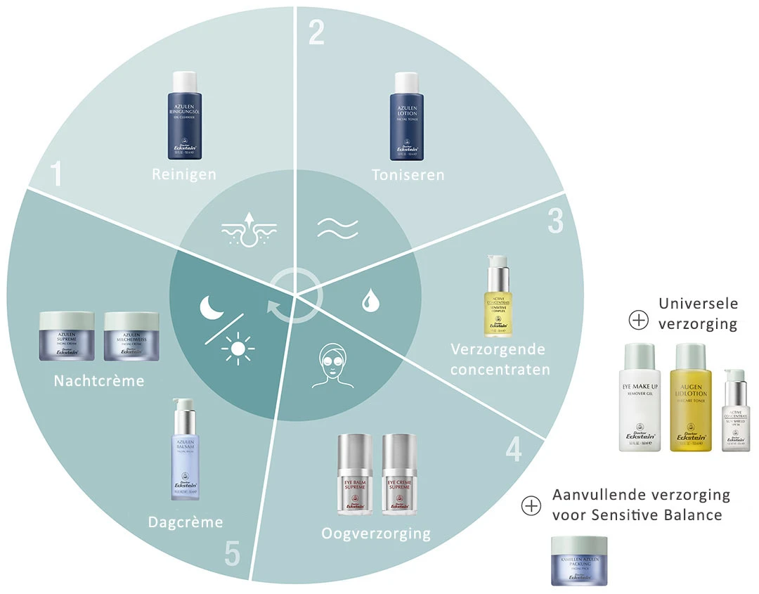 Deze Skincare Flow van Doctor Eckstein geeft een overzicht van alle producten die zijn afgestemd op de behoeften van het huiddoel Sensitive Balance en een ideaal verzorgingsritueel bieden voor een gevoelige huid. Gebruik de producten altijd in de aangegeven volgorde - dit is de enige manier om het zorgdoel optimaal te bereiken. Dit is hoe het werkt: