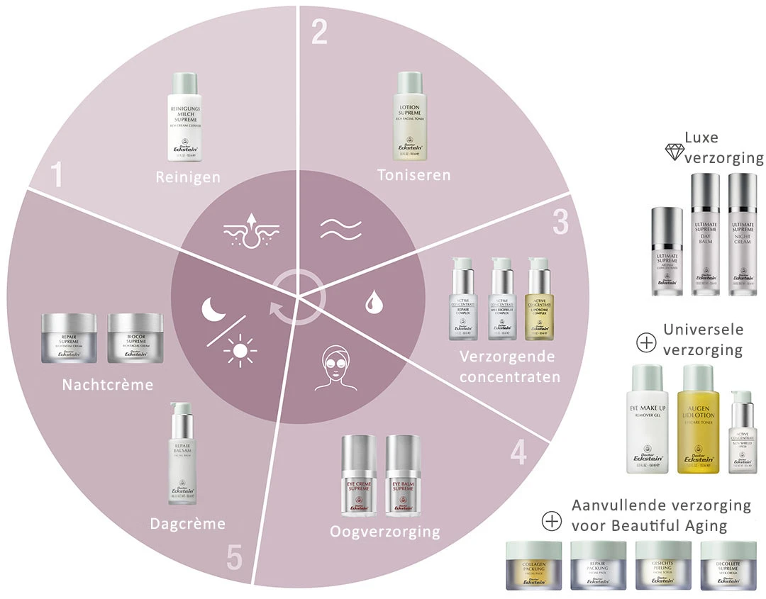 Deze skincare flow van Doctor Eckstein geeft jou een overzicht van alle producten die zijn afgestemd op de behoeften van het verzorgingsdoel "Beautiful Aging" en een ideaal verzorgingsritueel bieden voor de rijpere huid. Gebruik de producten altijd in de aangegeven volgorde - dit is de enige manier om het verzorgingsdoel optimaal te bereiken. Dit is hoe het werkt: