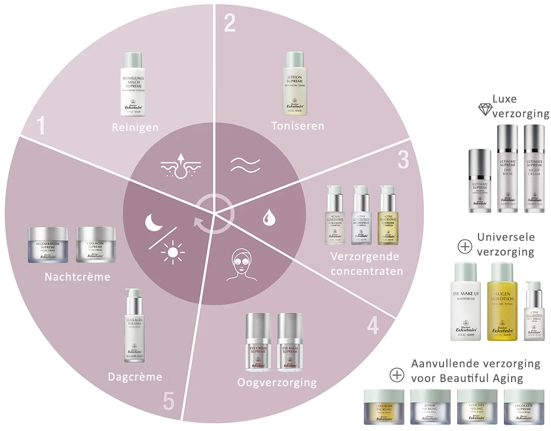 Deze skincare flow van Doctor Eckstein geeft jou een overzicht van alle producten die zijn afgestemd op de behoeften van het Beautiful Aging-verzorgingsdoel en resulteren in een ideaal verzorgingsritueel voor de veeleisende huid. Gebruik de producten altijd in de aangegeven volgorde - dit is de enige manier om het verzorgingsdoel optimaal te bereiken. Dit is hoe het werkt: